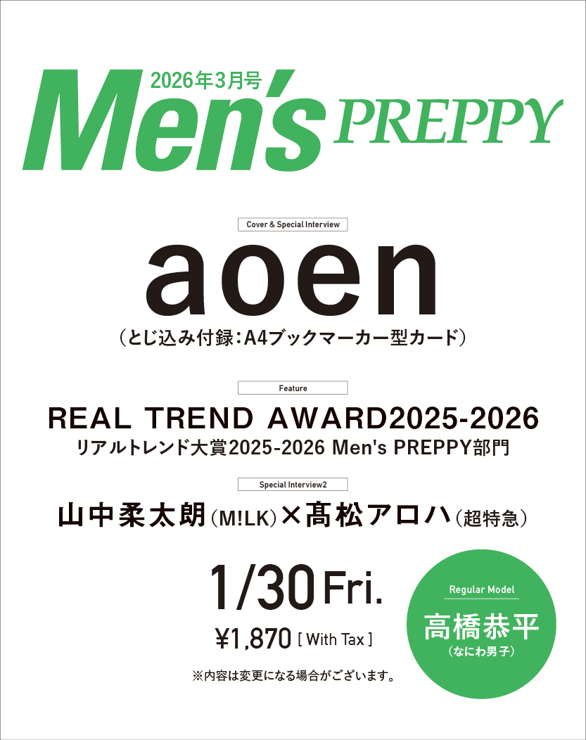 メンズプレッピー 2026年3月号(1/30発売)には新世代J-POPボーイズグループ・aoenが表紙に登場します。