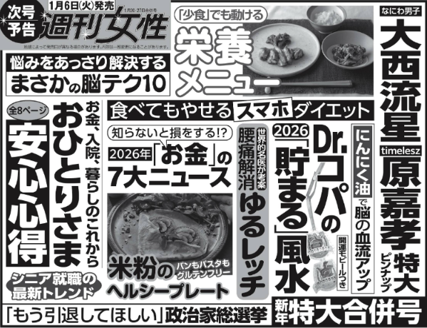 AD 週刊女性 2026年1/20・1/27 新春特大合併号 雑誌 2025.12.23 週刊女性 2026年1/20・1/27合併号 特大ピンナップ 大西流星&原嘉孝「横浜ネイバーズ」W主演 発売日 2026年1月6日(火) 週刊女性 2026年1/20・1/27 新春特大合併号 created by Rinker セブンネット タワーレコード Amazon 楽天市場 Yahooショッピング HMV&BOOKS