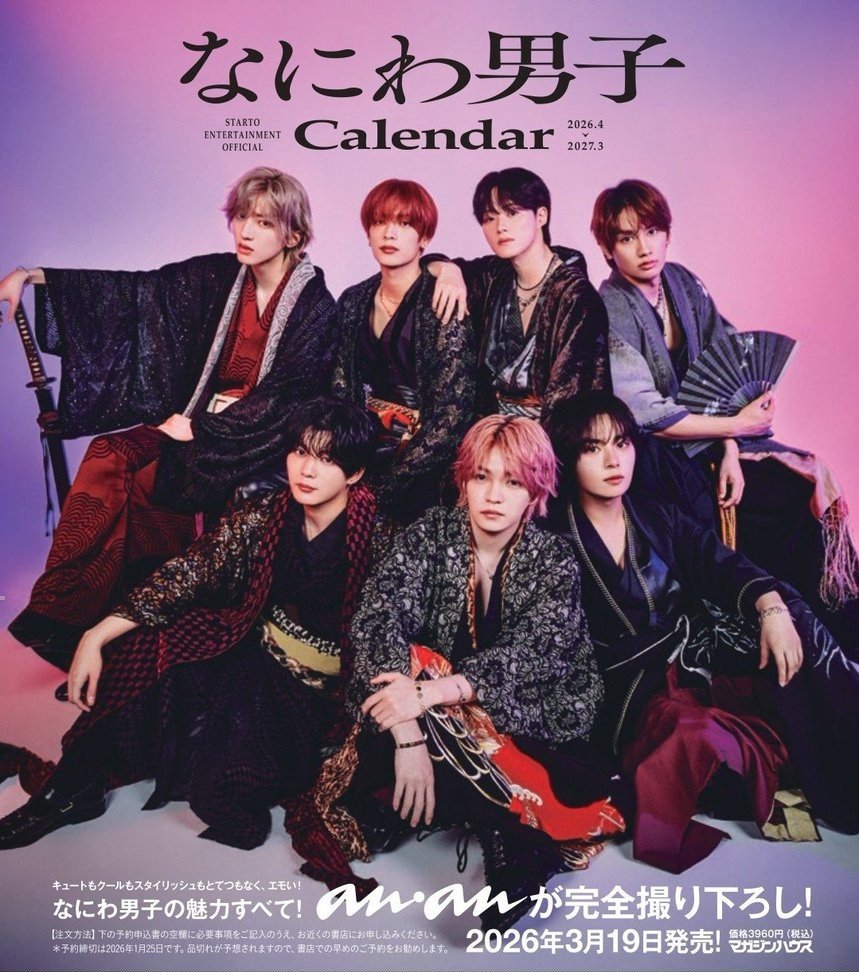 事務所公認カレンダー”2026.4-2027.3”版の発売が決定!なにわ男子カレンダーはanan(マガジンハウス)から発売されます。なにわ男子は、2022年に初めてのグループ単独カレンダーが発売され、4回目の単独カレンダー発売になります。